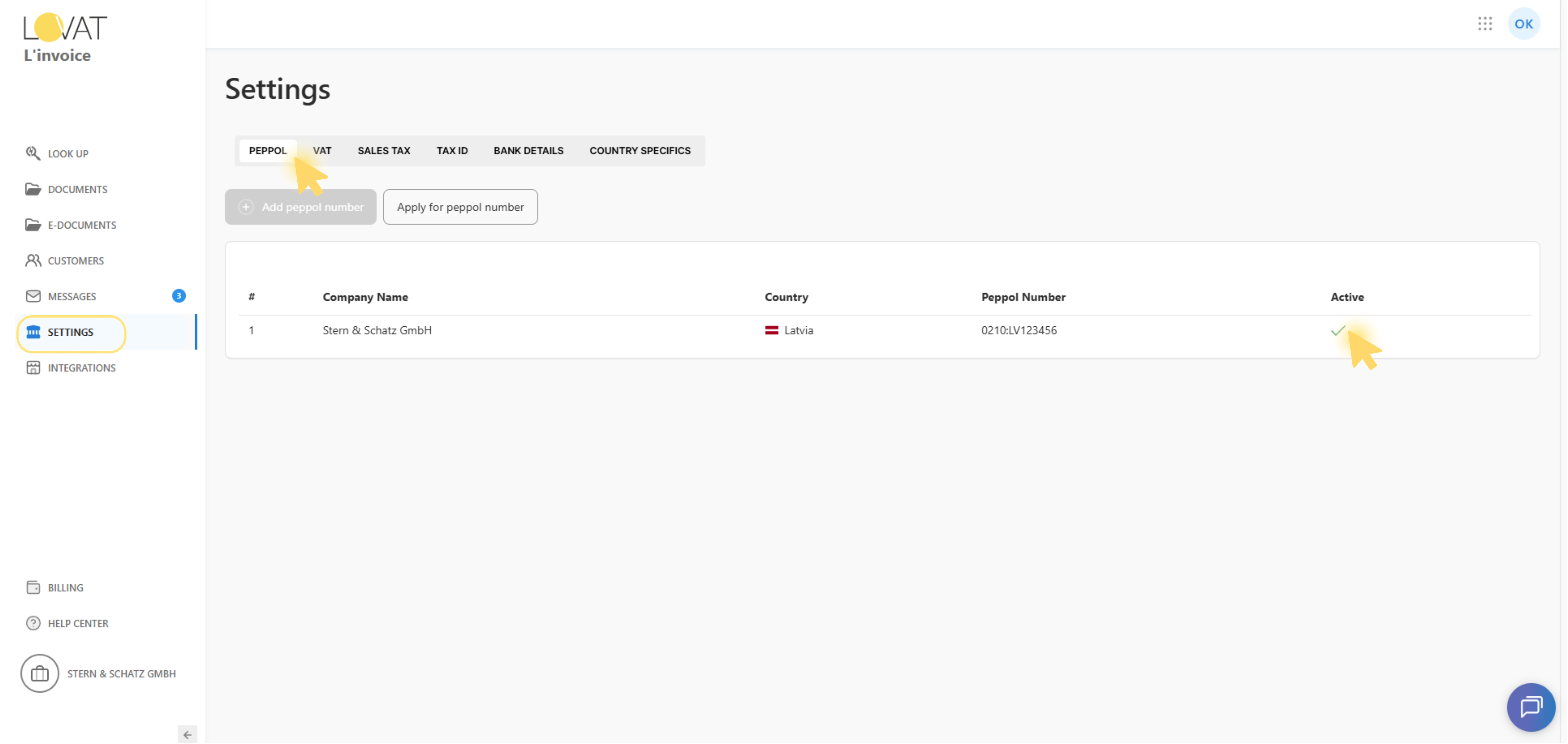 - for Peppol: profile is incomplete / Peppol ID not selected / no manager confirmation