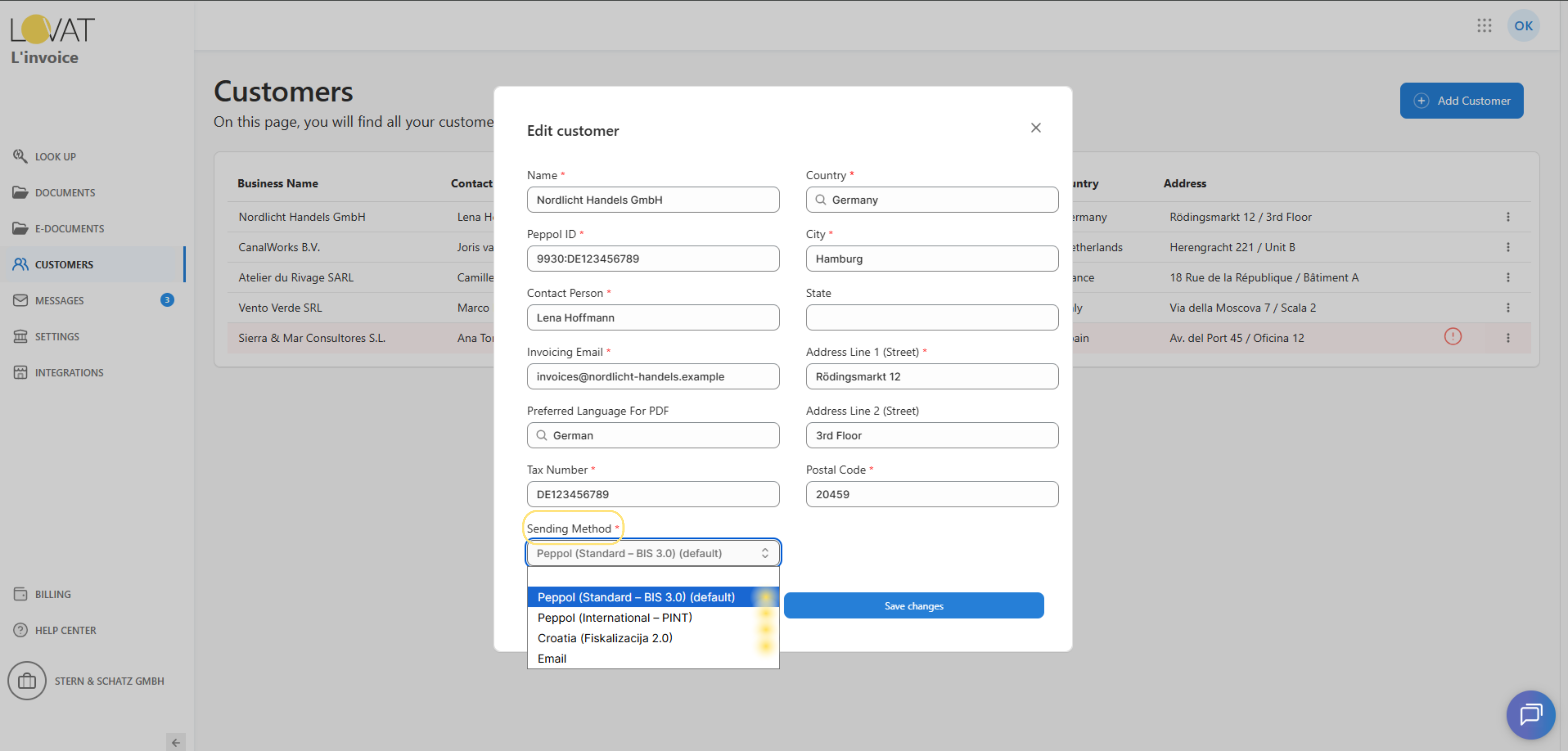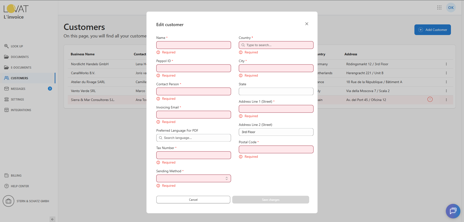 If the customer has Peppol (Standard — BIS 3.0) or Peppol (International — PINT) selected, the following conditions must be met before creating/sending an e-document.