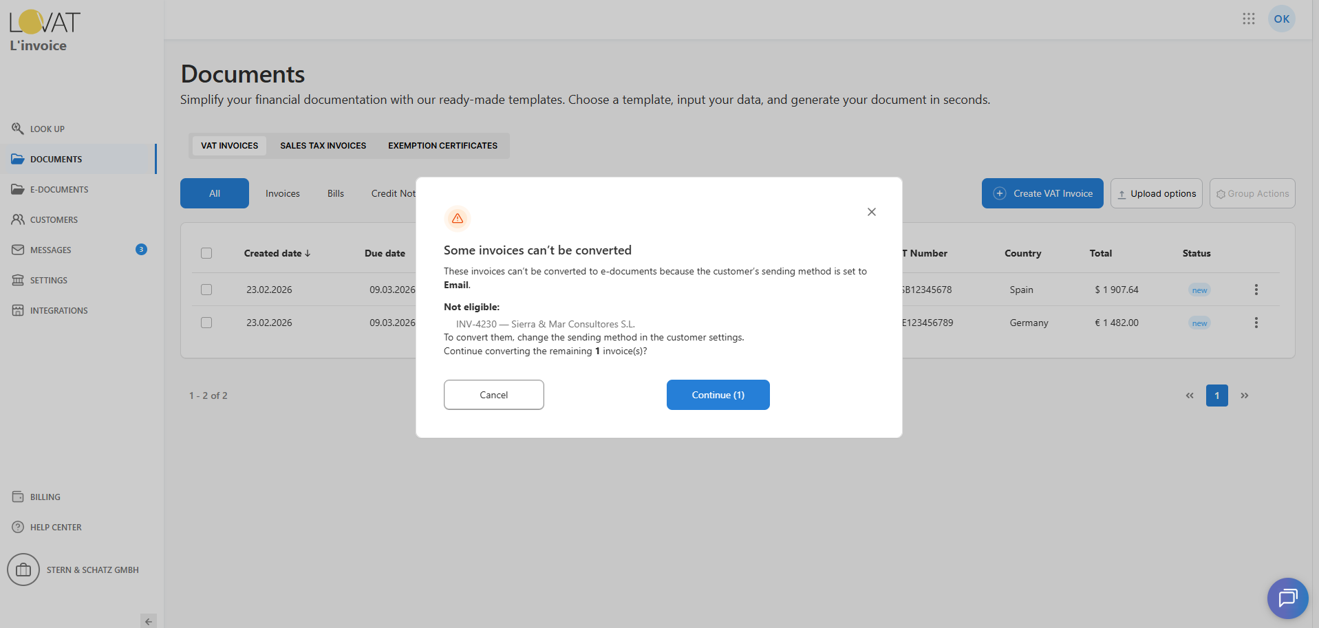 If among selected invoices there are any with sending_method = Email, the system will show a modal with warning. You can continue creating e-documents only for the invoices with supported sending methods.