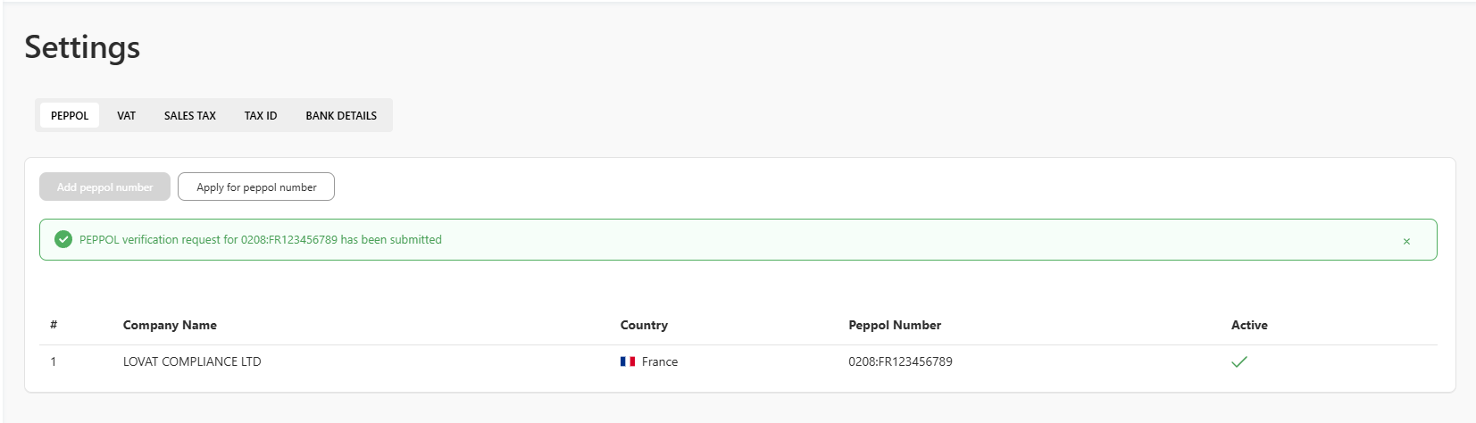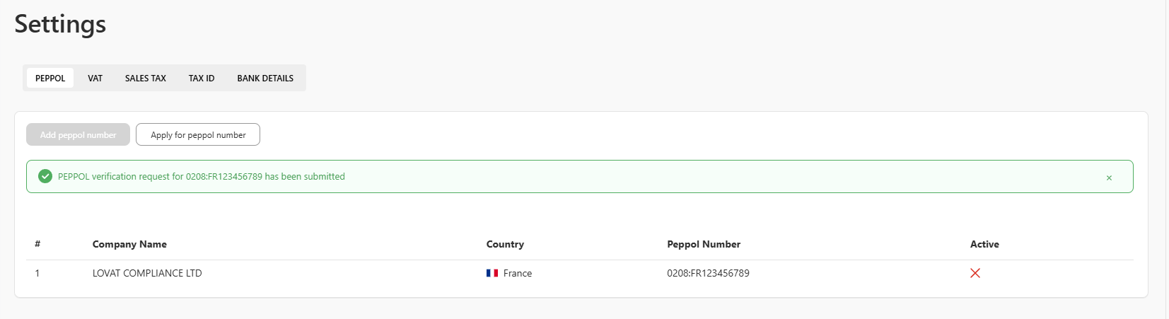 If the Active column does not show a green check mark (for example, shows a red cross ❌), the Peppol ID is not yet confirmed and cannot be used.
